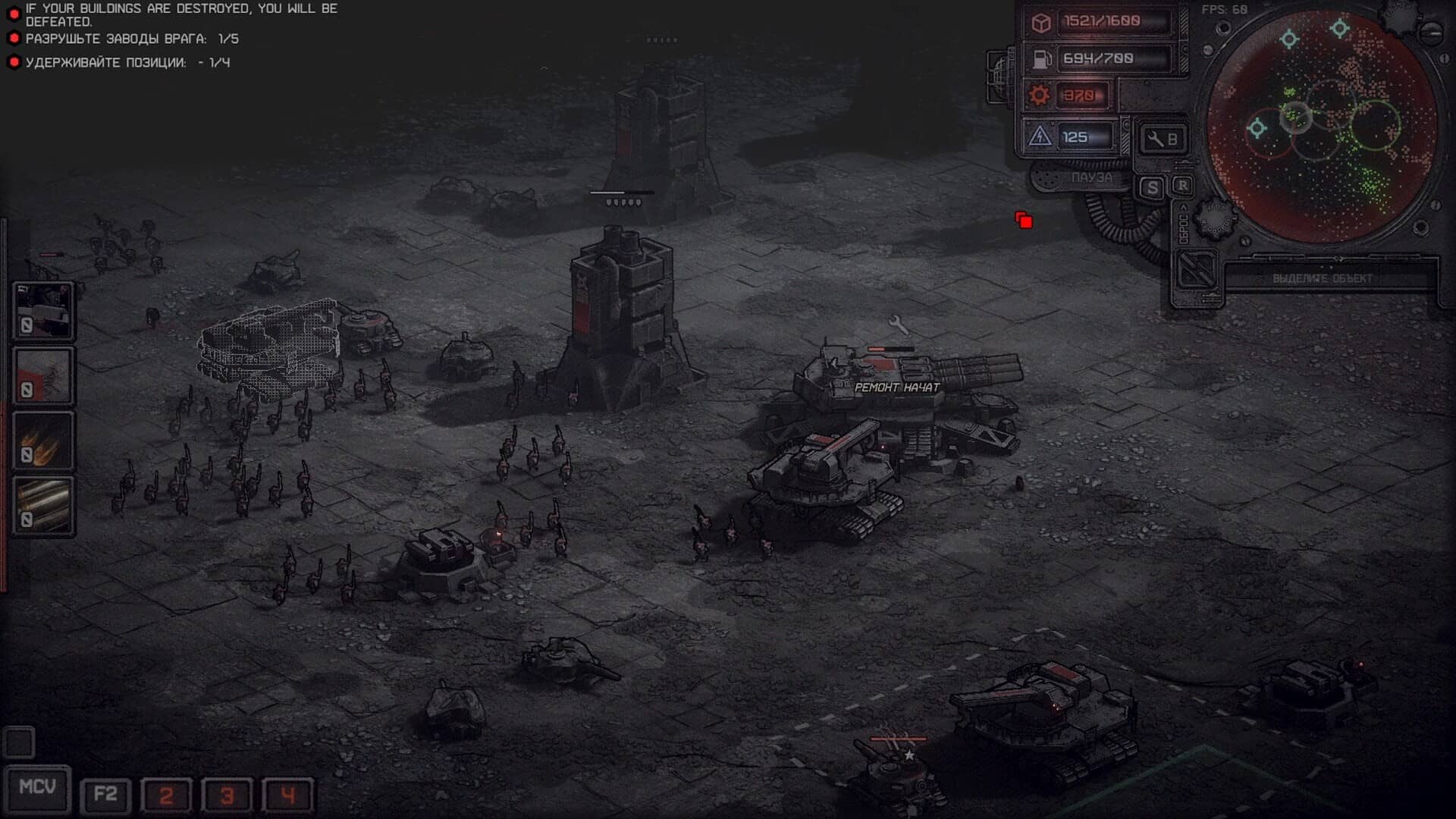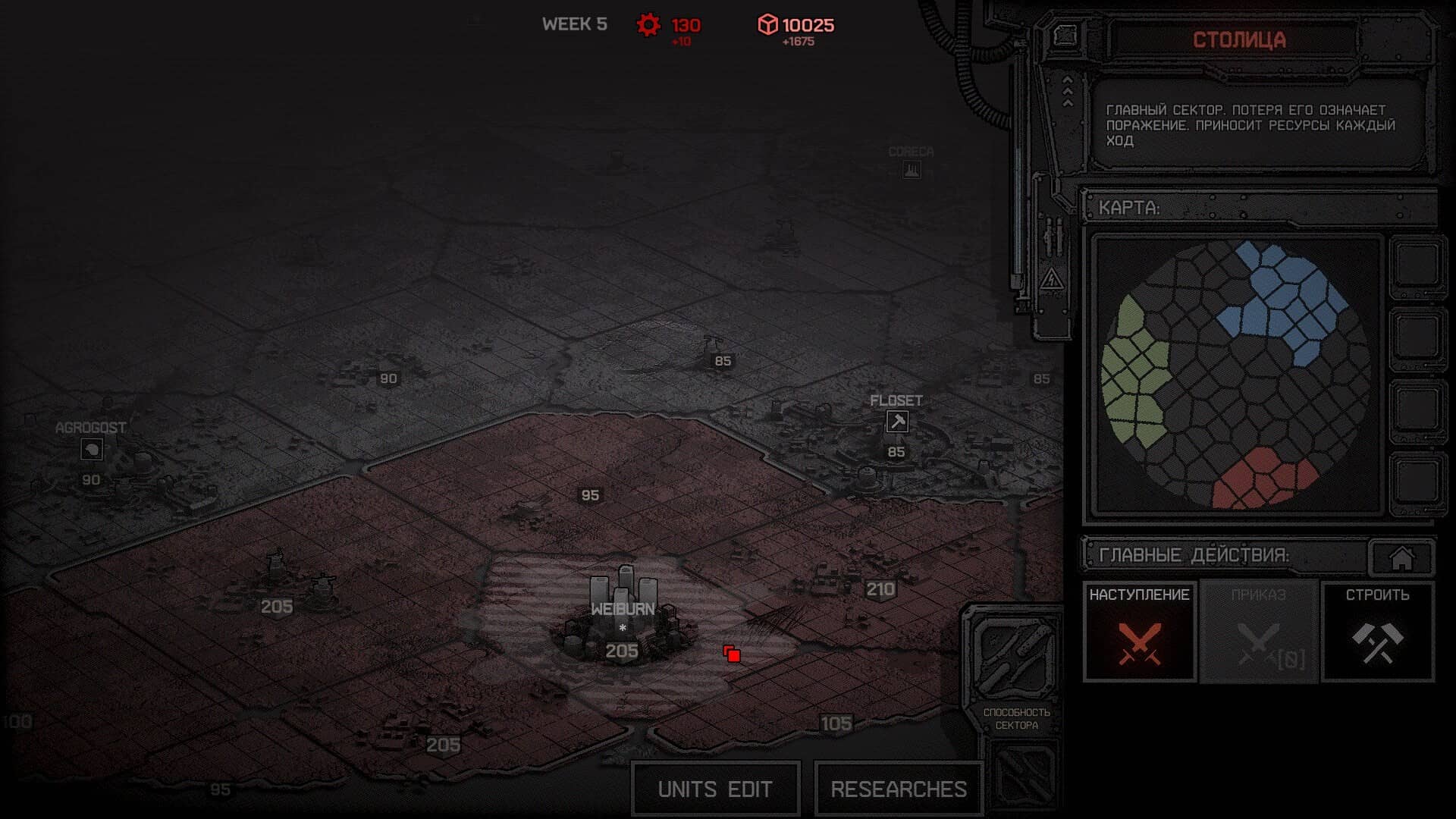 Строительство базы и сбор ресурсов. Заводы по производству техники, переработке минералов и казармы с хранилищами. Все строения важны и на глобальной карте.